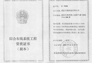 2001年取得“综合布线系统工程设计、施工资质证书”